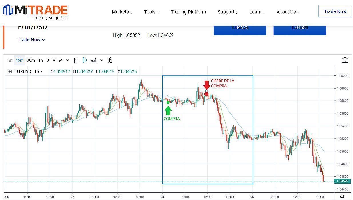 Supongamos que decides comprar el EUR/USD con 1 lote el día 28/06/2022, y transcurridas unas horas cierras tu compra generando un beneficio o una perdida, en este caso hablamos de trading intradía porque estamos abriendo esta operación y la cerramos el mismo día que ha sido abierta.