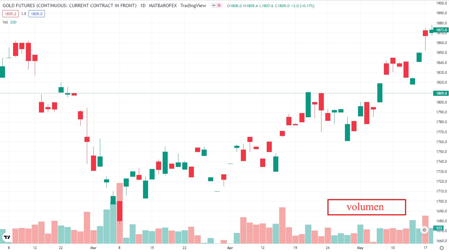 Aquí tenemos el gráfico del GOLD FUTURES, podemos ver la actividad de los traders mirando las barras de volumen.