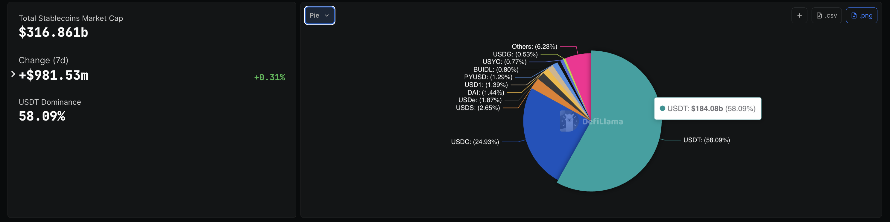 DeFiLlama data shows the stablecoin market capitalization stands at $316.86 billion, with Tether’s US Dollar-pegged USDT holding 58% market share.