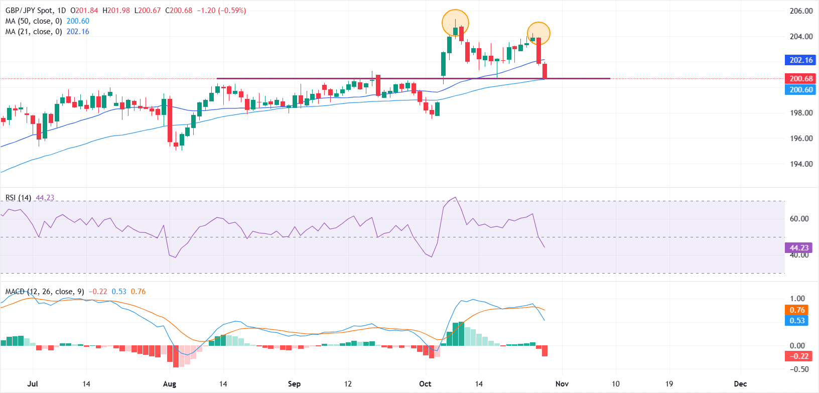 From a technical perspective, GBP/JPY is testing a critical confluence zone near the 200.00 psychological handle, which aligns with the 50-day Simple Moving Average (SMA) and a horizontal support that previously acted as resistance. The zone also coincides with the neckline of a potential double-top pattern, raising the risk of a bearish reversal if the price closes decisively below this level.