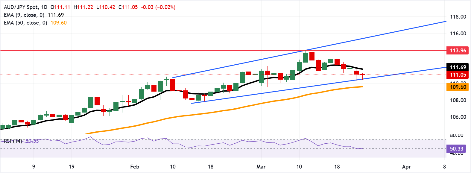 • AUD/JPY tests the immediate support at the lower ascending channel boundary around 110.60.