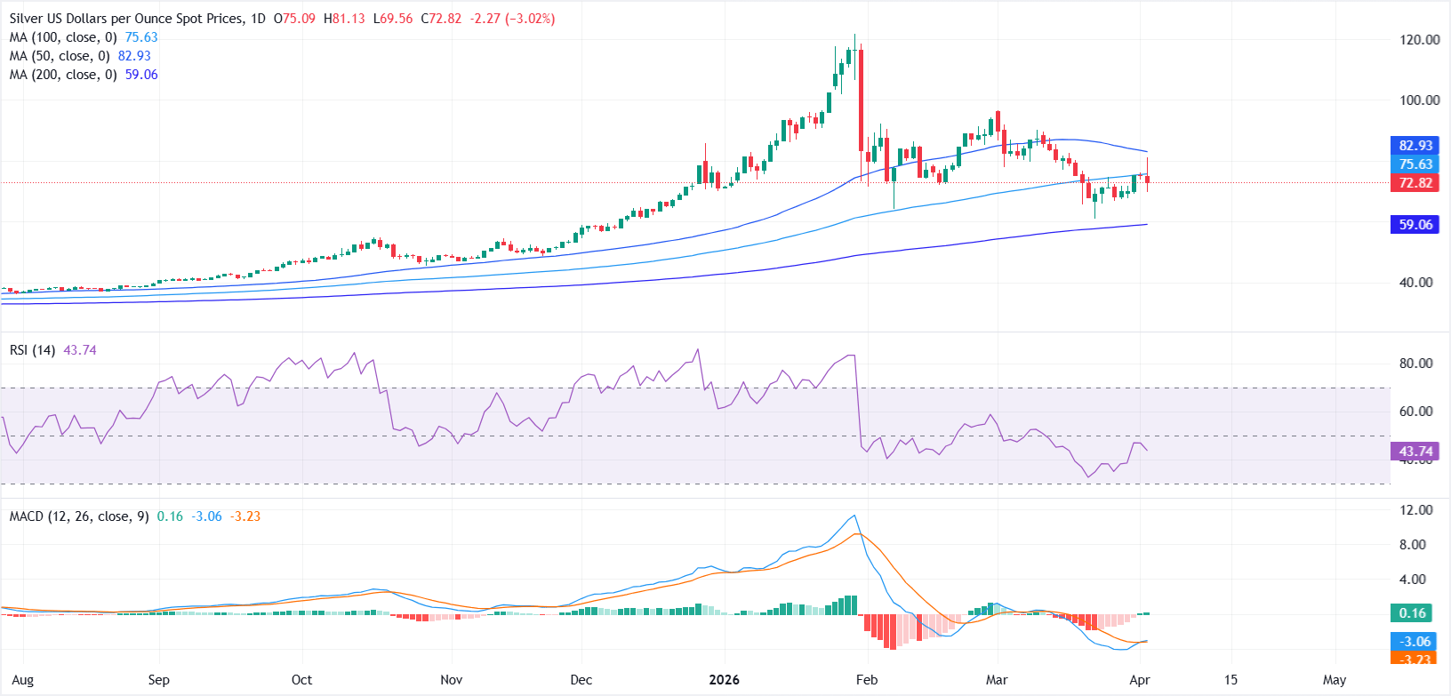 From a technical perspective, XAG/USD remains bearish in the near term, with repeated rejection at the 100-day Simple Moving Average (SMA) around $75.63 capping upside attempts. However, the pair continues to hold above the 200-day SMA at $59.06, indicating that the broader uptrend remains intact despite the recent weakness.