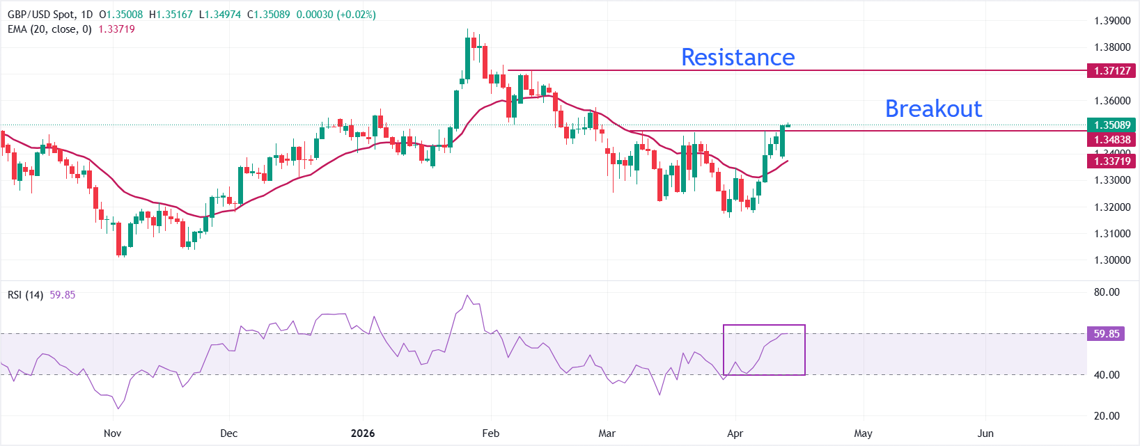GBP/USD trades higher at around 1.3515 as of writing. The pair holds a constructive bullish bias as spot delivers a breakout of the key resistance zone around 1.3500.