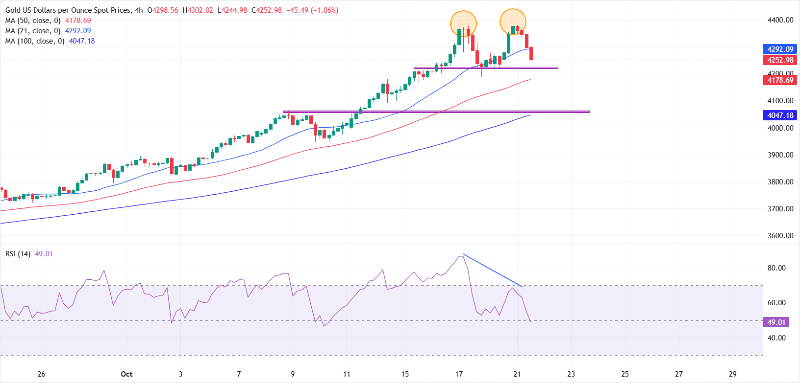 XAU/USD appears to have carved out a double top pattern on the 4-hour chart, with relatively equal highs around $4,380, indicating possible exhaustion in the recent uptrend. The metal has broken decisively below the 21-period Simple Moving Average (SMA), which now flips into immediate resistance if bulls attempt a rebound.