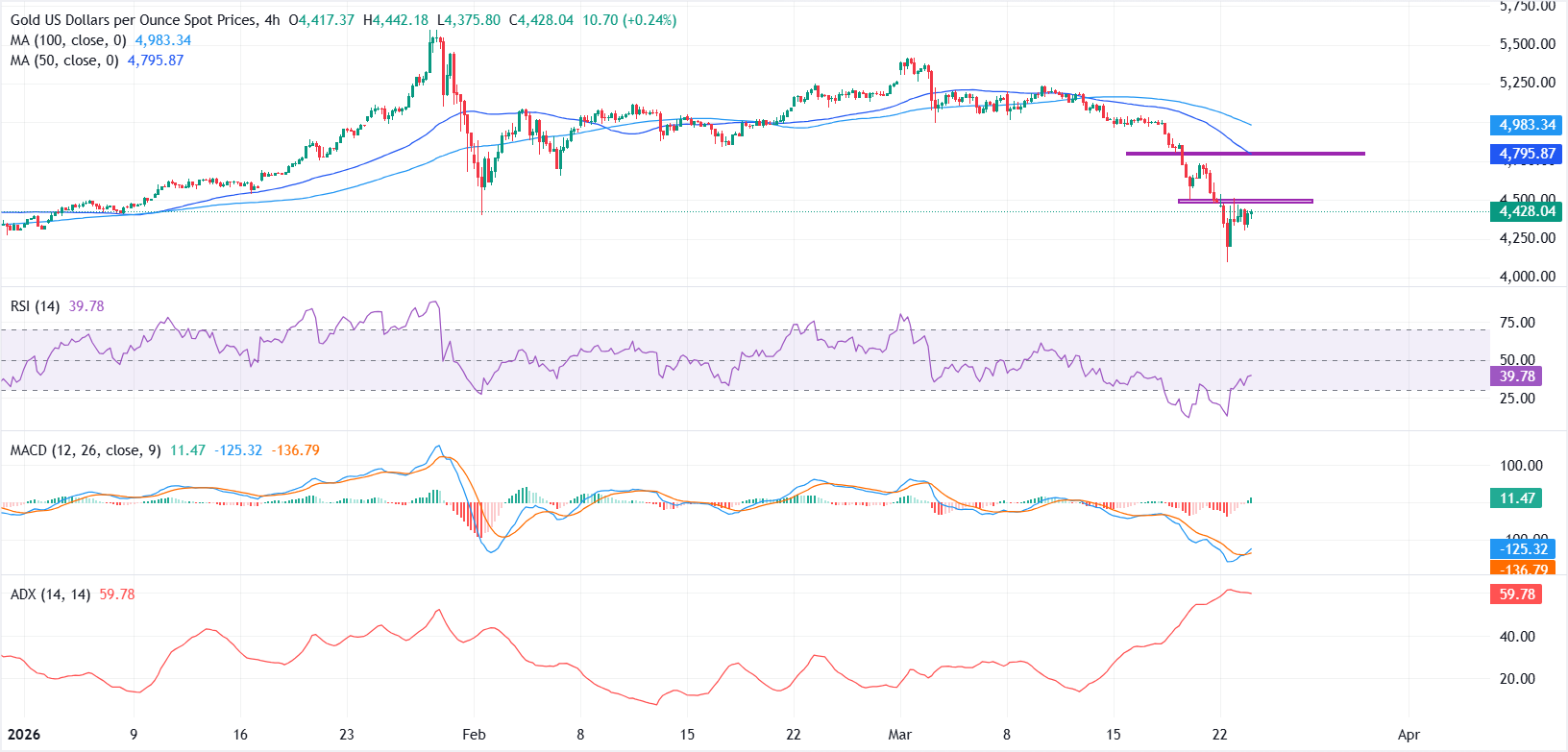 At the time of writing, XAU/USD trades around $4,428, bouncing from an intraday low of $4,306.