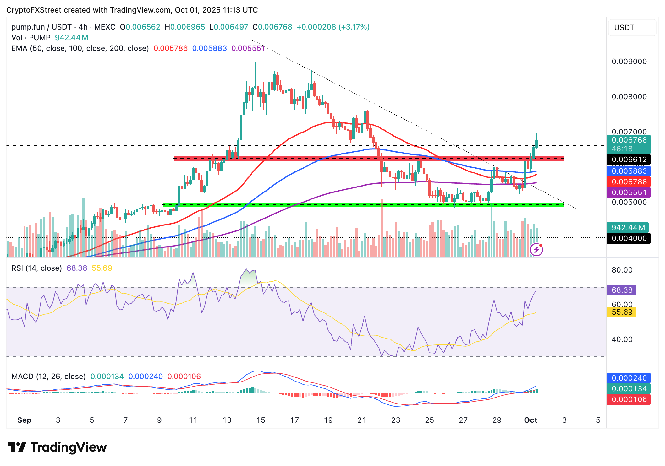 Pump.fun (PUMP) is gaining bullish momentum, advancing up over 13% to trade at $0.0067 on Wednesday. After surging to a new all-time high of $0.0089 on September 14, the meme coin platform native token trimmed most of the gains, testing support at around $0.0048.