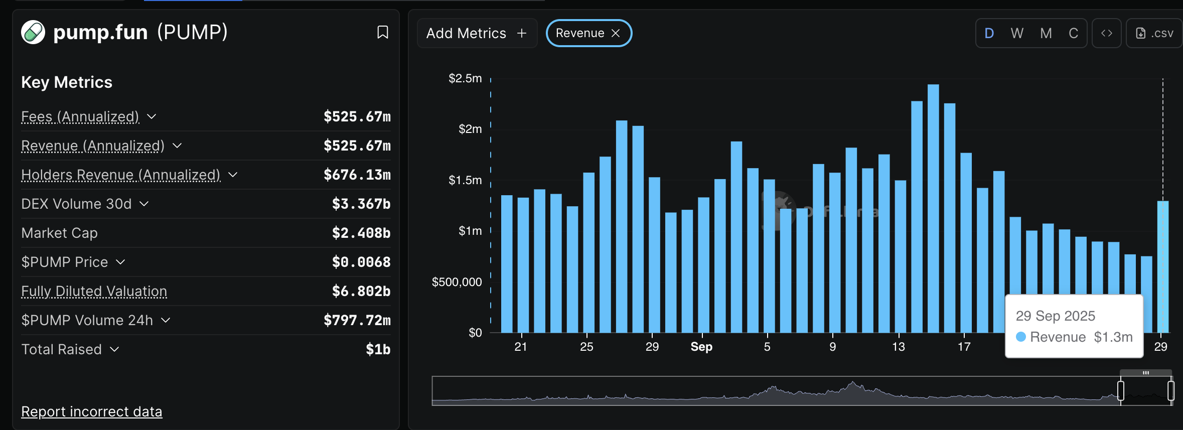 • Pump.fun meme coin launchpad revenue rises to $1.33 million on Tuesday after falling to $753K earlier in September.