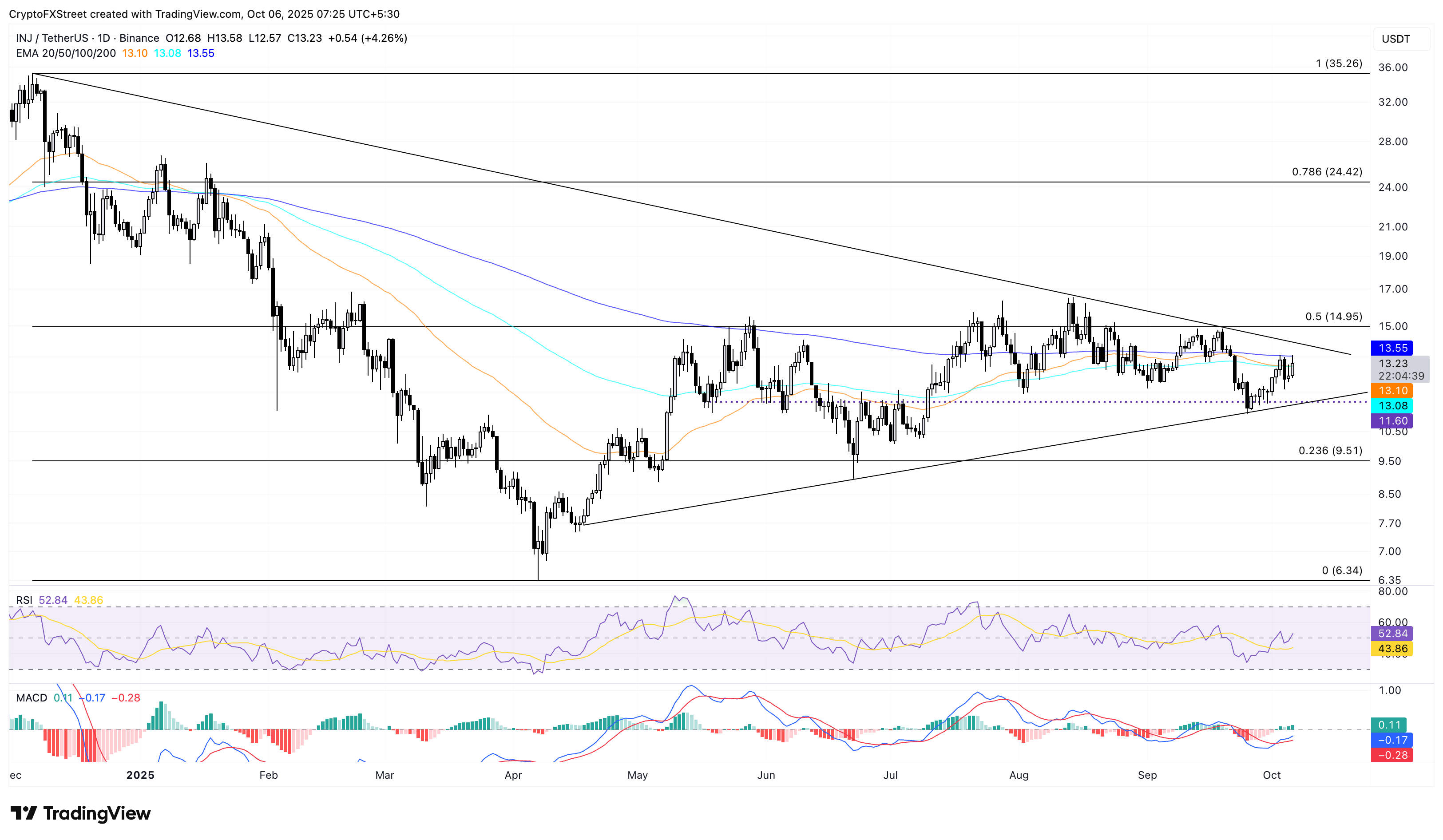 Injective extends the 1% gain from Sunday by over 5% at press time on Monday, marking a bullish start to the week. The short-term recovery struggles to surpass the 200-day EMA at $13.55.