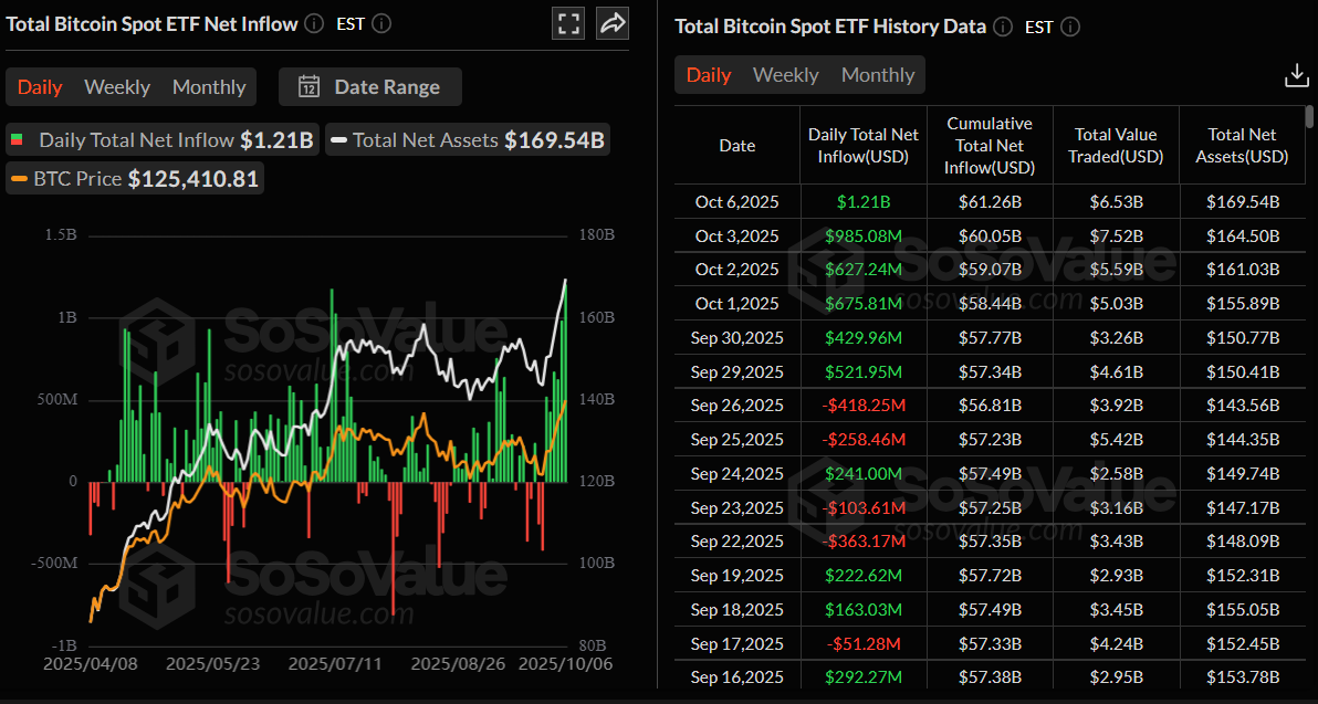 • US-listed spot ETFs recorded an inflow of $1.21 billion on Monday, keeping the streak of positive flows since September 29.
