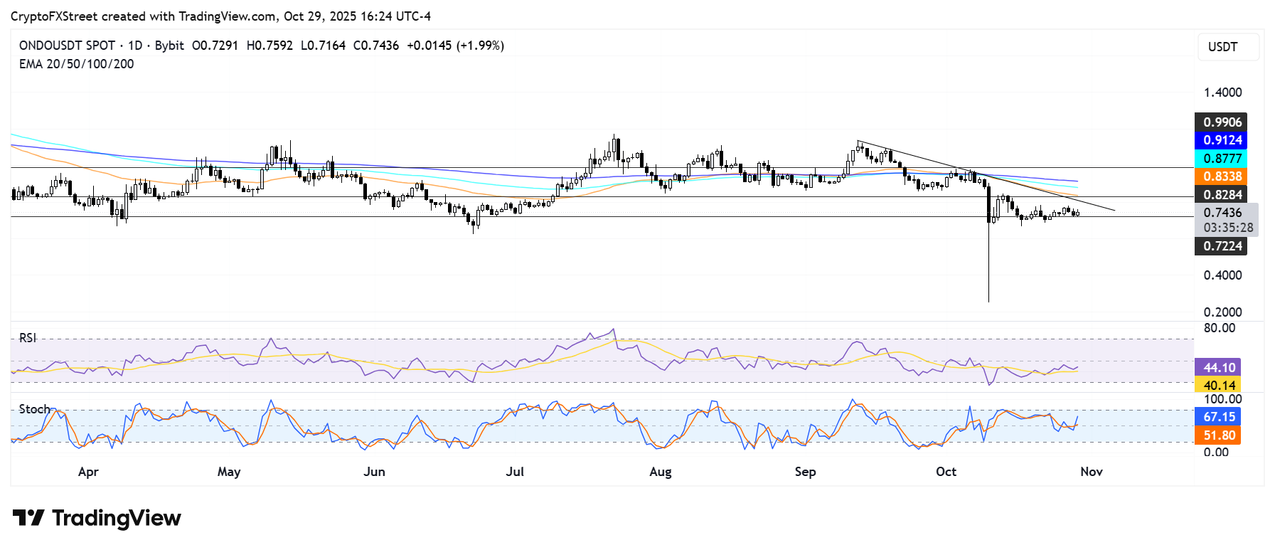 ONDO bounced off the support at $0.72 on Wednesday but faces resistance levels at $0.82 and a descending trendline extending from September 12.