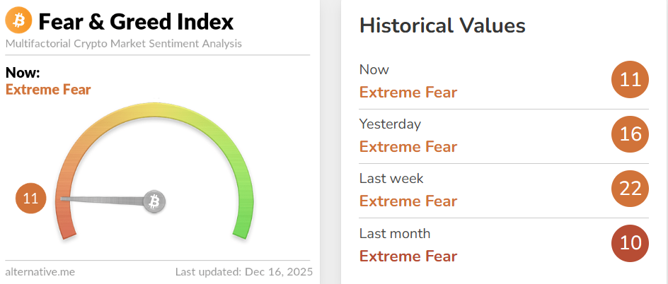 The Fear and Greed Index has fallen to 11 on Tuesday, nearing the end of November lows, indicating a sharp shift toward extreme fear as market participants brace for further downside.