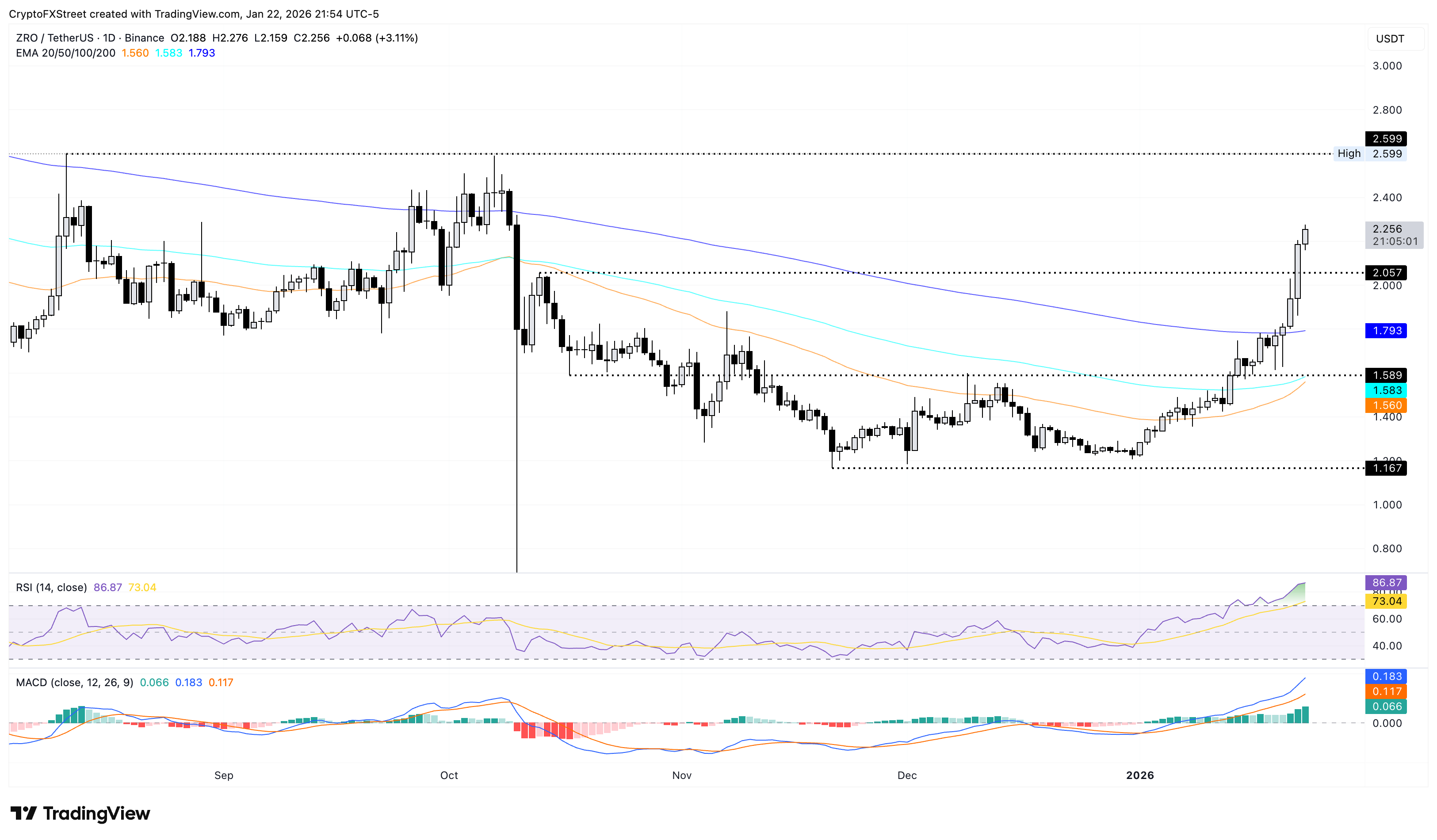 LayerZero is up 3% at press time on Friday, extending the 13% rise from the previous day. The cross-chain messaging token rallies for the fifth consecutive day, lifting the 50-day Exponential Moving Average (EMA) to $1.56 and the 100-day EMA to $1.58, signaling short-term strength and approaching a potential crossover.