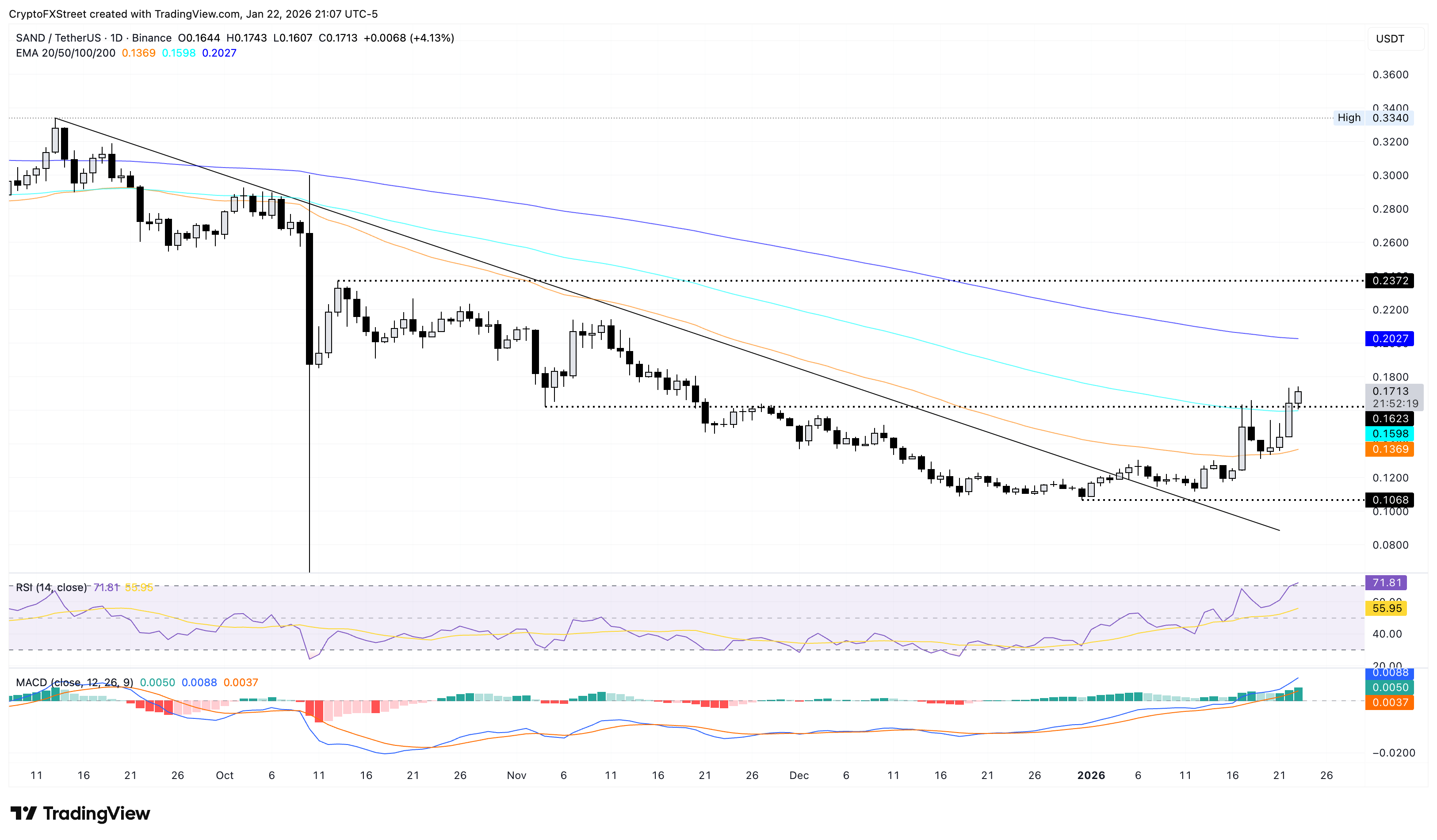 Sandbox extends the recovery run by 4% above the 100-day EMA at $0.1598 at the time of writing on Friday. The gaming token aims for the 200-day EMA at $0.2027 as it clears the $0.1623 resistance level marked by the November 4 low.