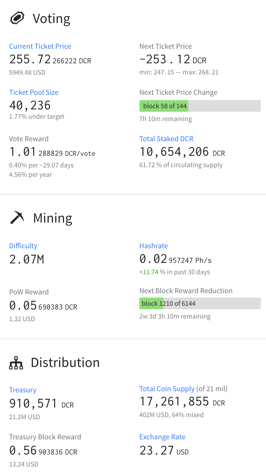 • DCR mining hashrate has increased over 10% in the last 30 days, while more than 60% of the circulation supply is staked.