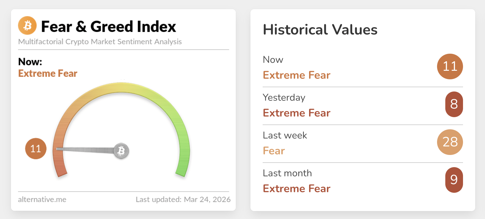 Sentiment across the crypto market remains weak, as reflected by the Fear & Greed Index, which is holding at 11 in extreme fear territory. The index improved marginally amid Trump’s war optimism, but its impact on risk appetite appears to lag.
