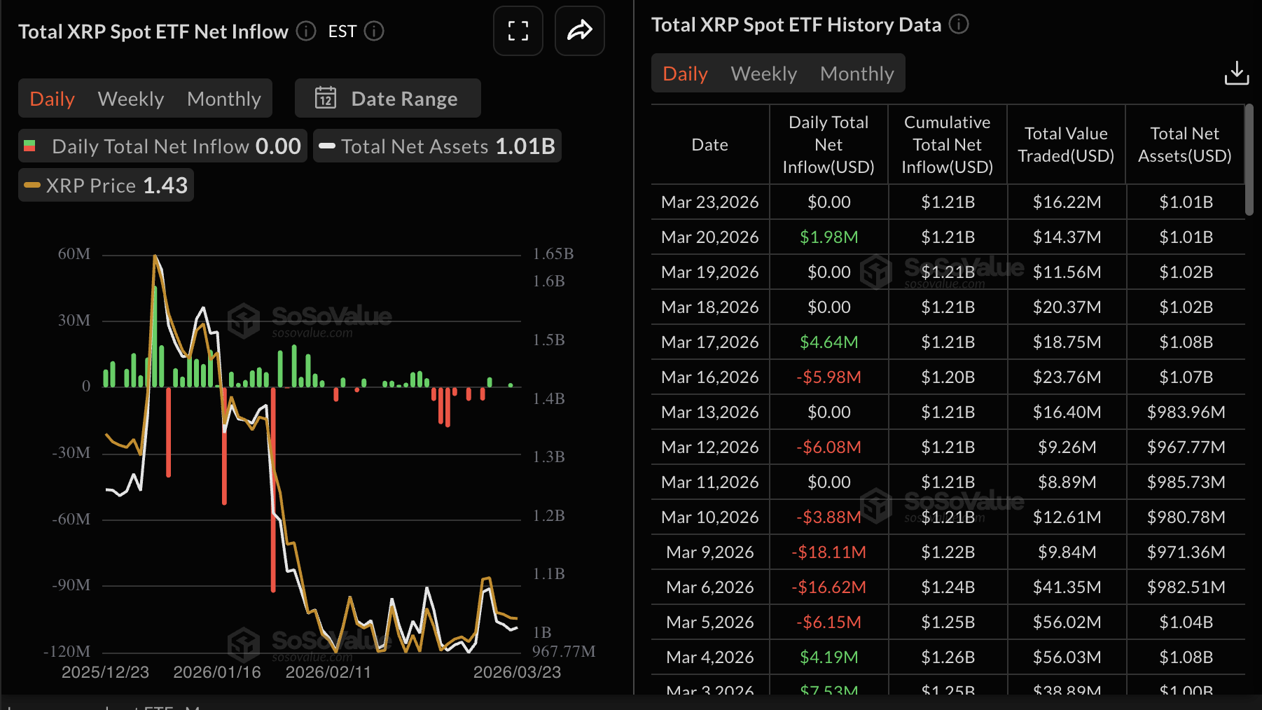 Similarly, demand for XRP spot Exchange-Traded Funds (ETFs) also lagged, with muted activity on Monday. Although XRP recorded inflows of $1.98 million on Friday, the overall sentiment still lags. SoSoValue data shows that there have been only two days of inflows into US-listed ETFs since March 6. Cumulative inflows stand at $1.21 billion, and net assets under management at $1.01 billion.
