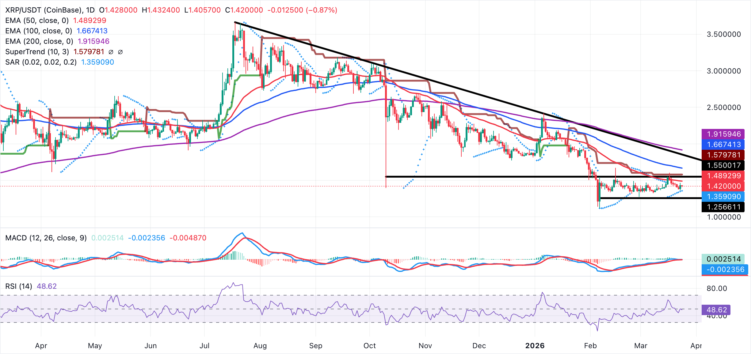 XRP hovers above $1.40 amid a broadly bearish outlook, with the price below a long-standing descending trendline. Major moving averages appear to be capping potential rebounds from $1.49. The SuperTrend indicator highlights the dynamic resistance at $1.58, further limiting recovery attempts.
