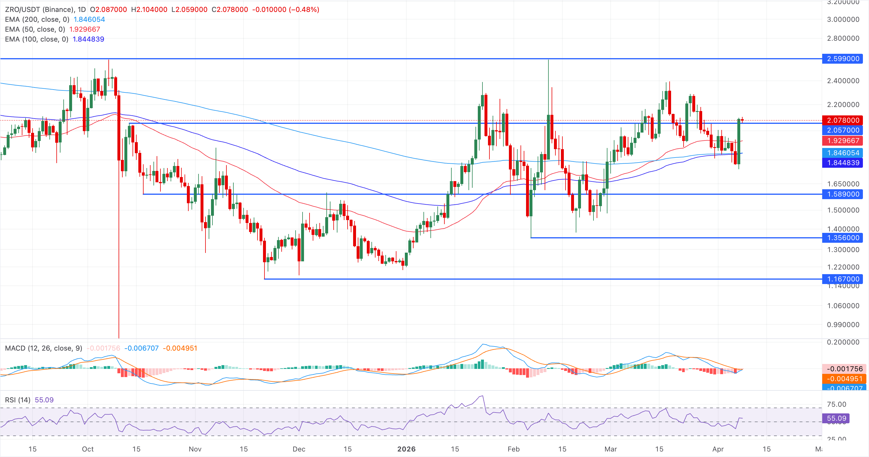 If ZRO drops below $2.00, the 50-day EMA at $1.92 provides immediate support.