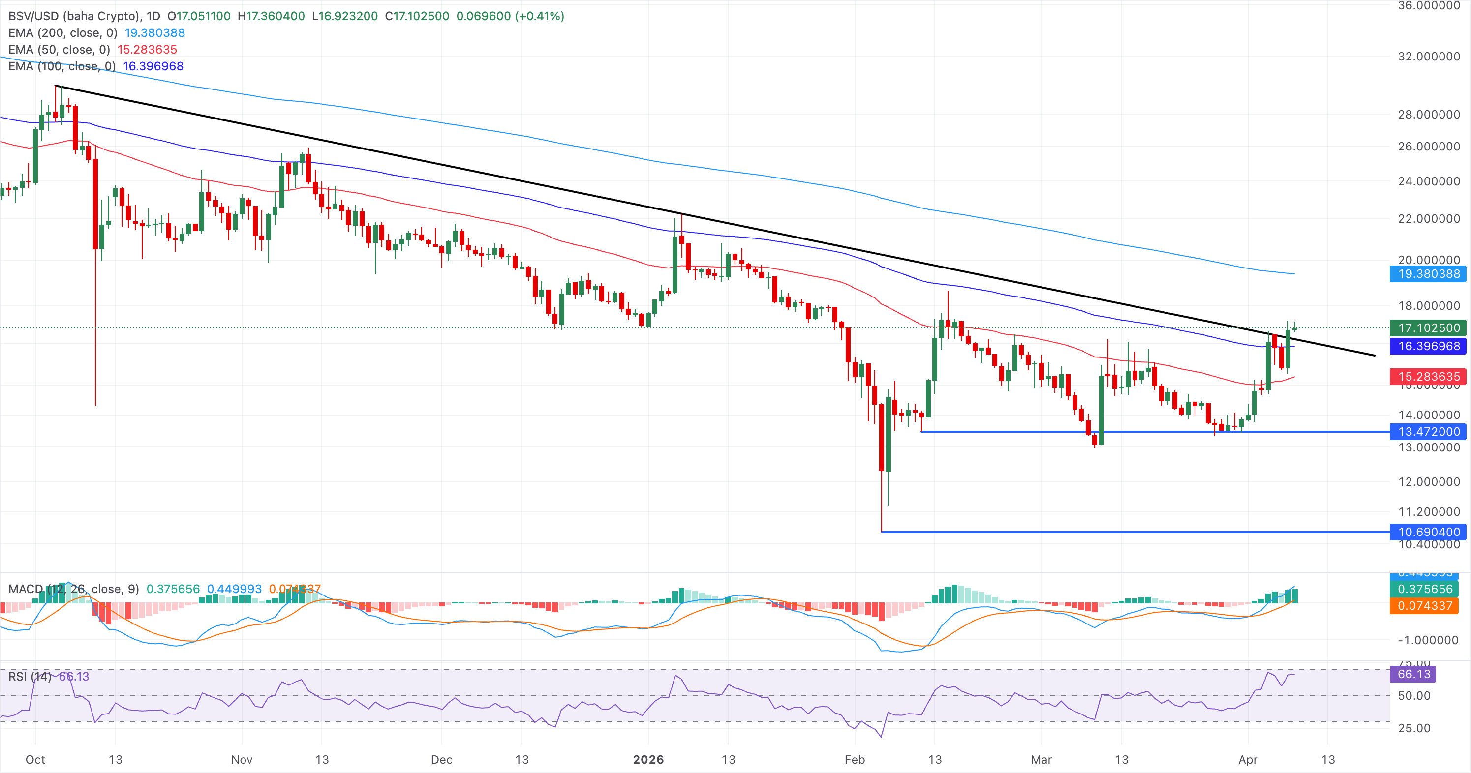 Bitcoin SV is trading above $17 at press time on Wednesday, after breaking above the descending resistance trend line near $16.90 and the 100-day EMA the previous day.