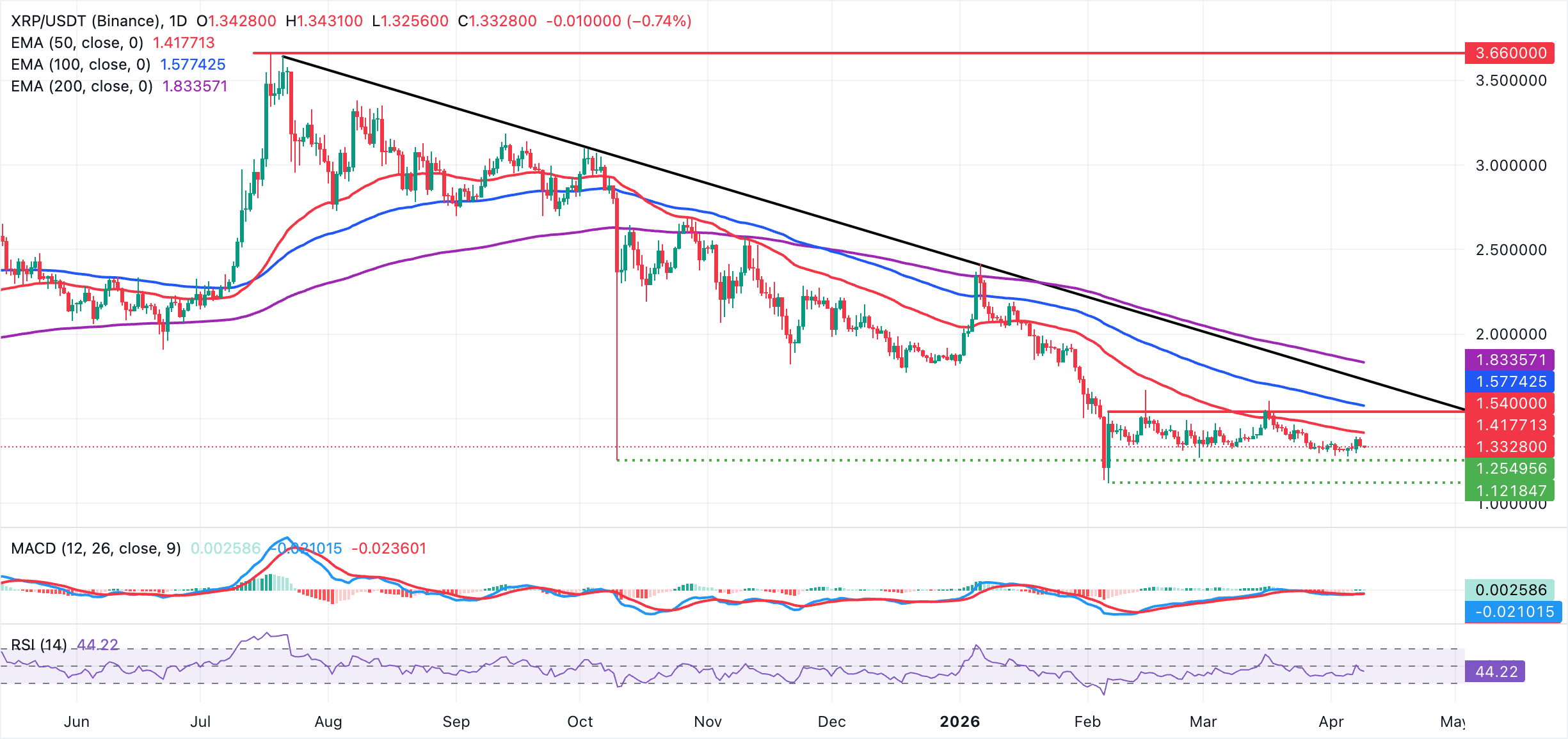 XRP is trading at roughly $1.33, under clear downside pressure, with price holding beneath the 50-day, 100-day, and 200-day Exponential Moving Averages (EMAs) at $1.42, $1.58, and $1.83, respectively, which keeps the broader trend tilted to the downside despite the recent bounce.