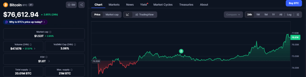 Bitcoin reacted fast. The leading cryptocurrency jumped sharply after Araghchi’s announcement and rose above $76,000 — its highest mark since February. At the time of reporting, it was trading around $76,612, up more than 2% on the day, according to TradingView data.