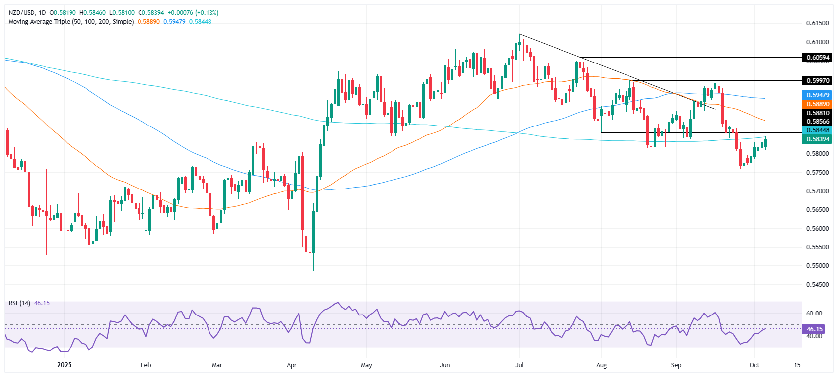 • Kiwi buyers target a close above the 200-day SMA at 0.5848 to trigger a bullish extension.