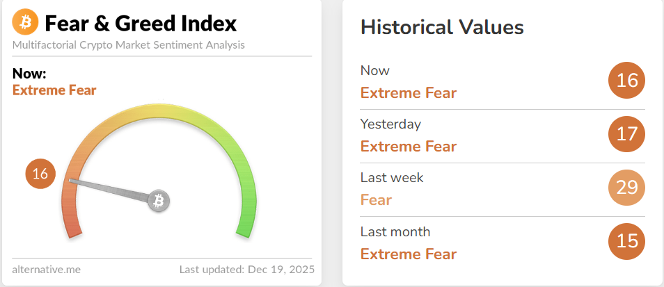 The Fear and Greed Index fell to 16 on Friday from 29 the previous week, suggesting the crypto market is currently in a deep risk-off phase, in line with falling prices, ETF outflows, and weak momentum.