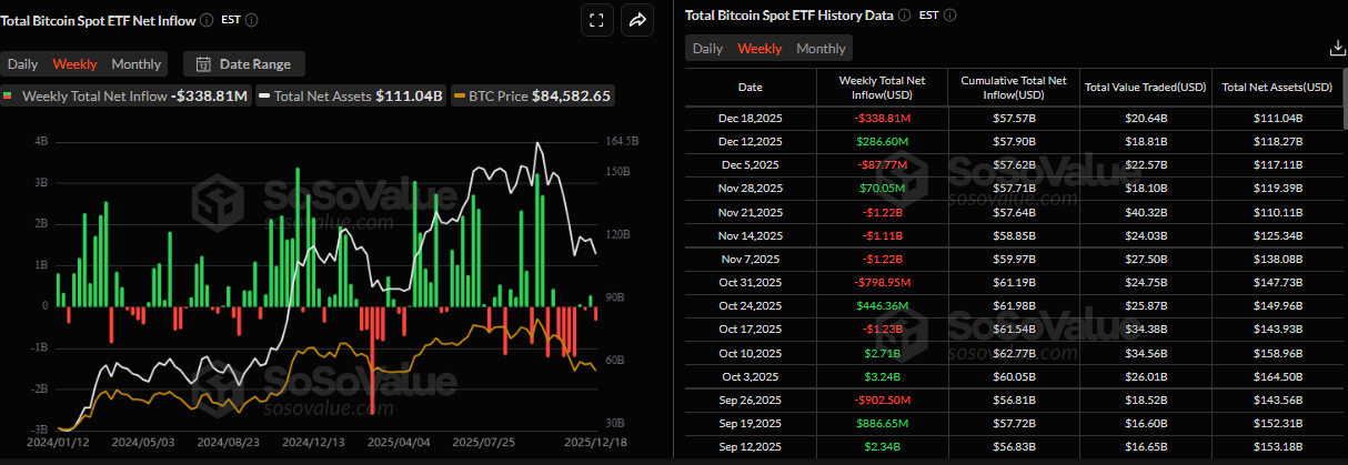 Bitcoin price correction this week was supported by weakening institutional demand. SoSoValue data show that Spot Bitcoin ETFs recorded a net total outflow of $338.81 million by Thursday, marking the largest weekly outflow since November 21 and breaking the previous week’s streak of positive inflows. If these outflows continue and intensify, the Bitcoin price could see further correction.