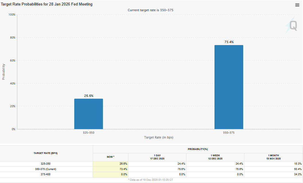 Market participants are now pricing a 26.6% probability that the Fed will reduce interest rates by 25 basis points (bps) to the range of 3.25%-3.50% at its next meeting in January, according to the CME FedWatch tool. These macroeconomic conditions could trigger risk-on sentiment in markets, boosting riskier assets such as Bitcoin.