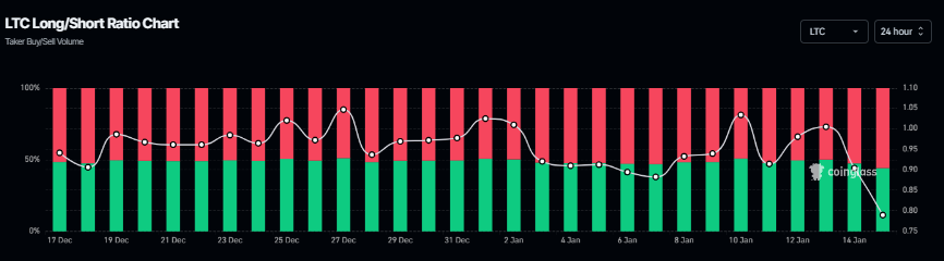 파생시장에서도 약세 쪽으로 무게가 실린다. Coinglass 기준 라이트코인의 롱-숏 비율은 0.78로 1을 밑돈다. 이는 상승보다 하락에 베팅한 포지션이 더 많다는 의미로, 단기 심리가 방어적임을 보여준다.