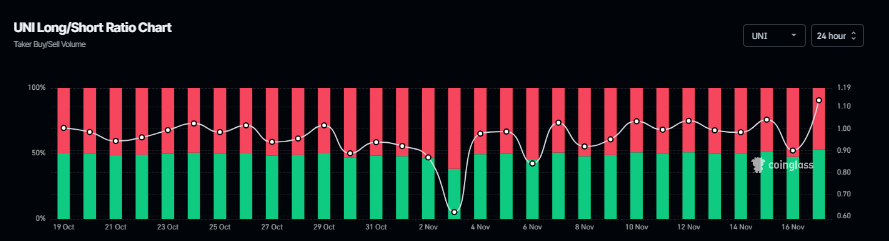 파생상품 지표도 비슷한 방향을 가리킨다. 코잉글래스(Coinglass) 기준, UNI의 롱·숏 비율은 1.12로 최근 한 달 사이 가장 높은 수준이다. 비율이 1을 웃돈다는 것은, 하락에 베팅하는 숏보다 상승을 노리는 롱 포지션이 더 많이 쌓였다는 뜻이다.