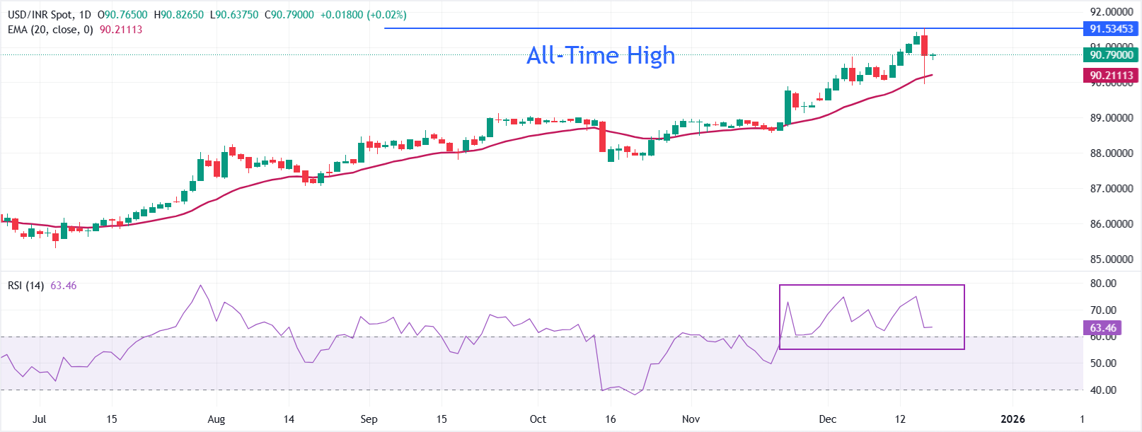 In the daily chart, USD/INR trades at 90.7840. The pair holds above a rising 20-day EMA at 90.2106, preserving an upward bias. The average continues to slope higher, keeping pullbacks contained. RSI at 63.40 stays in bullish territory after easing from overbought, confirming firm momentum.