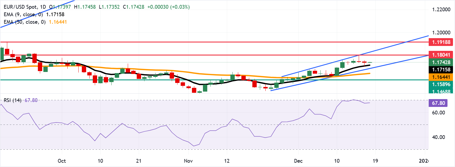 The immediate support lies at the nine-day EMA of 1.1715, followed by a psychological level of 1.1700 and the lower ascending channel boundary around 1.1690. A break below this support area would weaken the short-term price momentum and put downward pressure on the EUR/USD pair to test the 50-day EMA at 1.1644, followed by the three-week low of 1.1589, which was recorded on December 1.