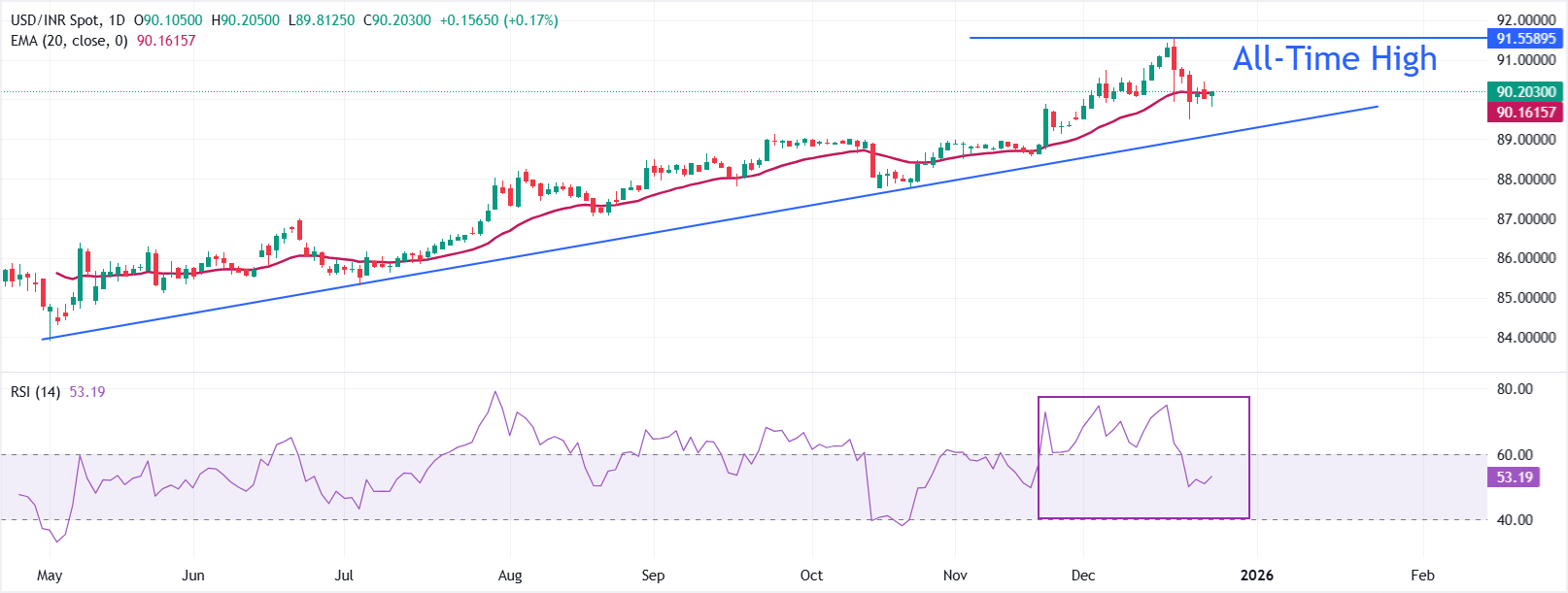 In the daily chart, USD/INR trades at 90.2085. It holds above the 20-day EMA at 90.1621, though the average has begun to flatten after a steady climb, preserving a mild bullish bias. RSI at 53 (neutral) reflects cooled momentum from prior overbought readings. The rising trend line from 83.9428 underpins the setup, with support aligning near 89.1667. Holding above the average keeps the bias positive, while a close below trend support would turn the tone lower.