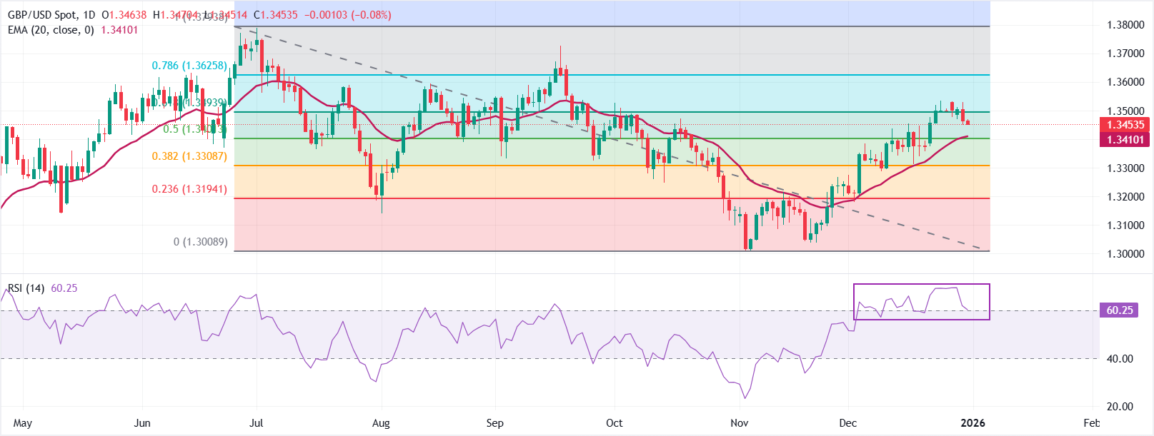 In the daily chart, GBP/USD trades at 1.3454, slightly down on the day. The 20-day EMA at 1.3410 trends higher, and the price holds above it, maintaining a near-term bullish bias. The average has advanced steadily in recent sessions and now offers immediate dynamic support. The RSI at 60 sits on the positive side of neutral and has eased from recent peaks, keeping momentum constructive without overextension.