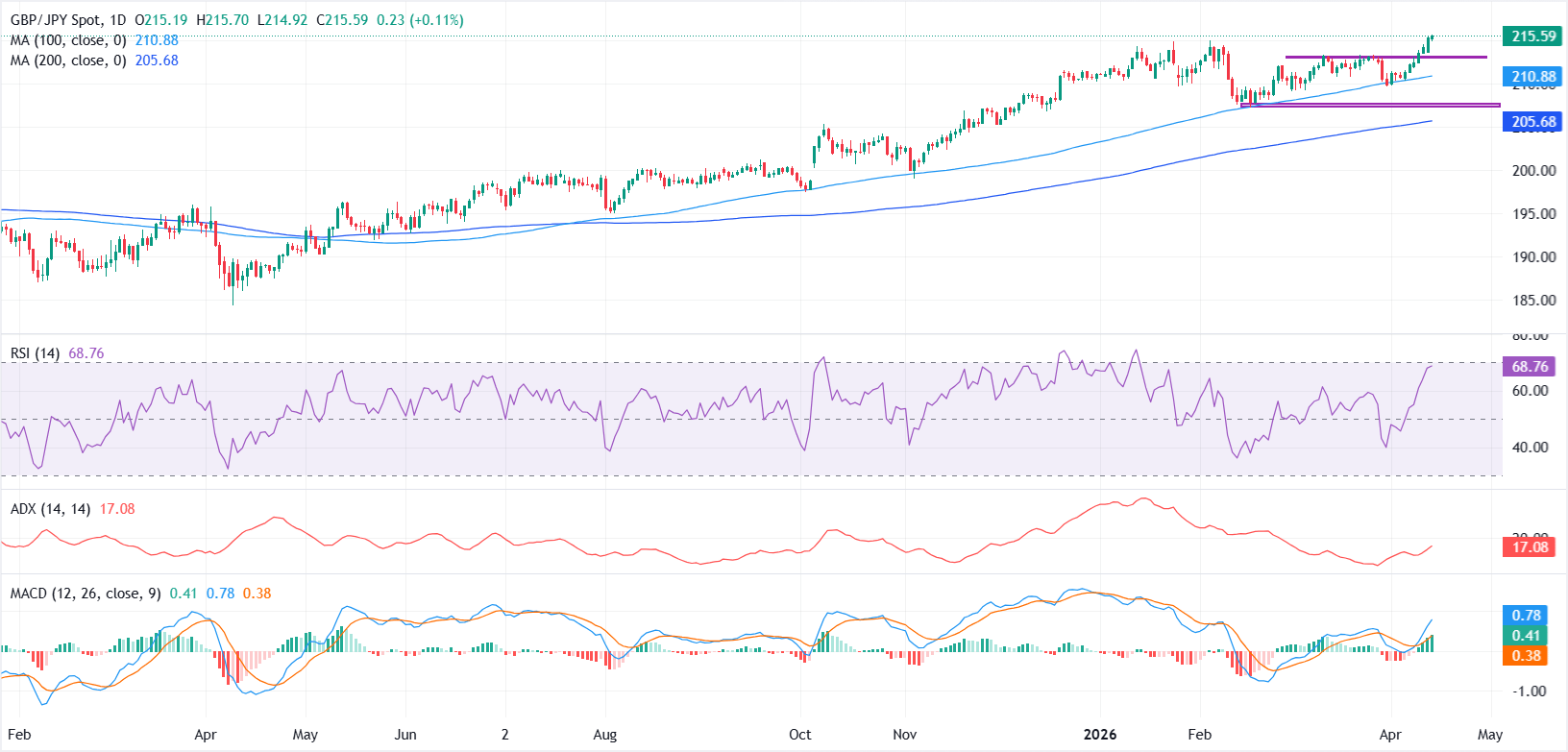 GBP/JPY advances on Tuesday, extending gains for a seventh consecutive day as elevated Oil prices continue to weigh on the Japanese Yen (JPY), while improving market sentiment, driven by renewed hopes of US-Iran negotiations, supports the British Pound (GBP). At the time of writing, the cross is trading around 215.60, its highest level since July 2008.