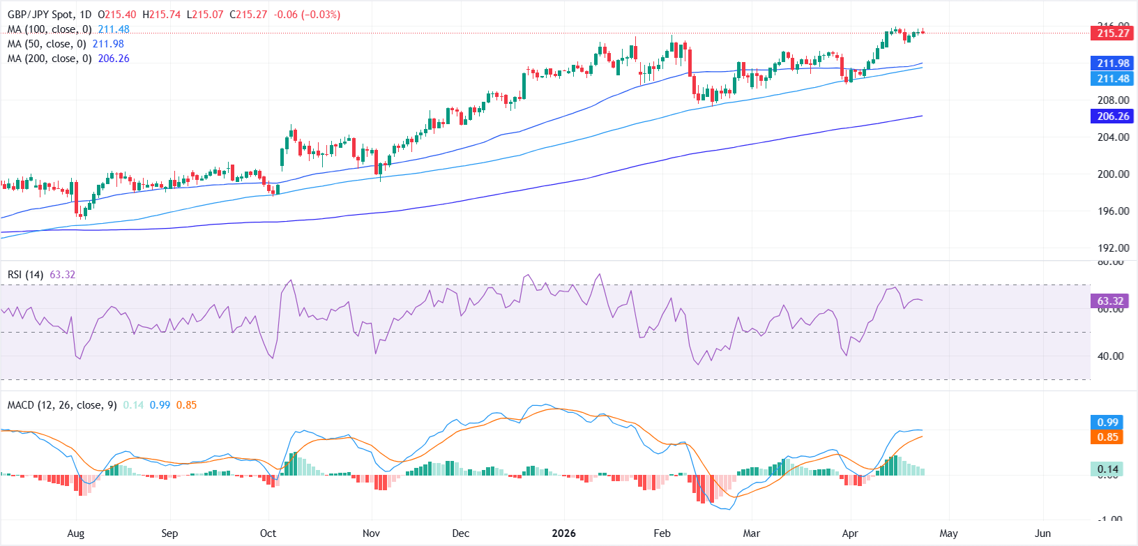 At the time of writing, GBP/JPY is trading around 215.27, easing from an intraday high of 215.74.