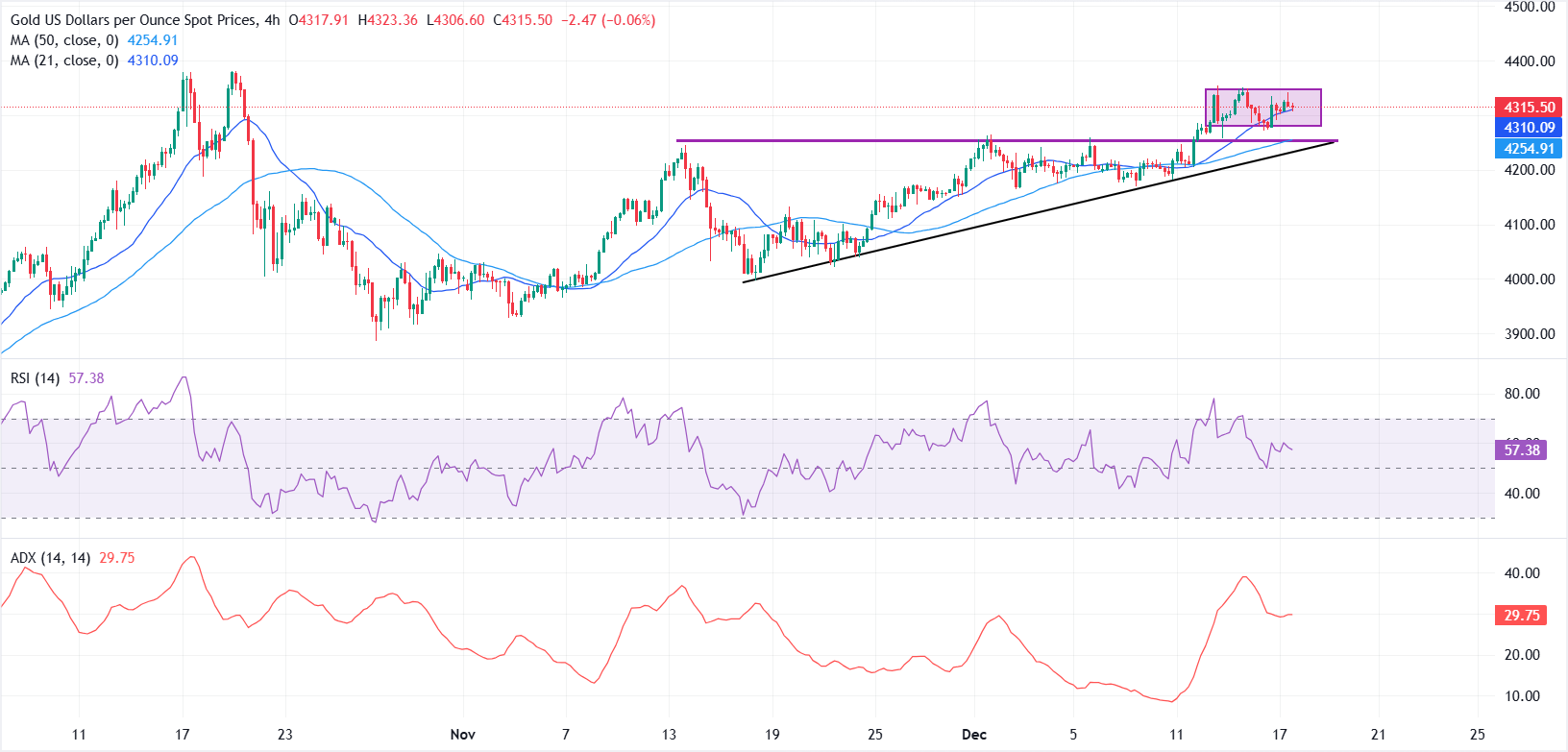 On the 4-hour chart, XAU/USD continues to trade within an ascending structure, supported by a rising trendline drawn from the mid-November lows near $4,000.