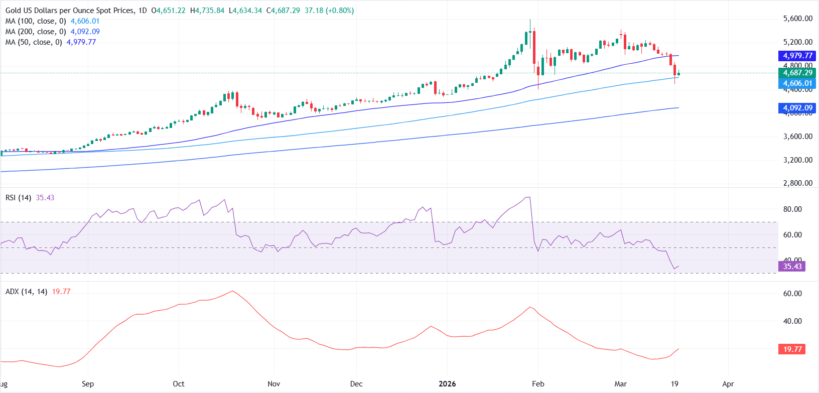 On the daily chart, Gold is attempting to stabilize above the 100-day Simple Moving Average (SMA) near $4,605 after sliding below the 50-day SMA around $4,979 earlier this week, highlighting growing selling pressure in the near term.