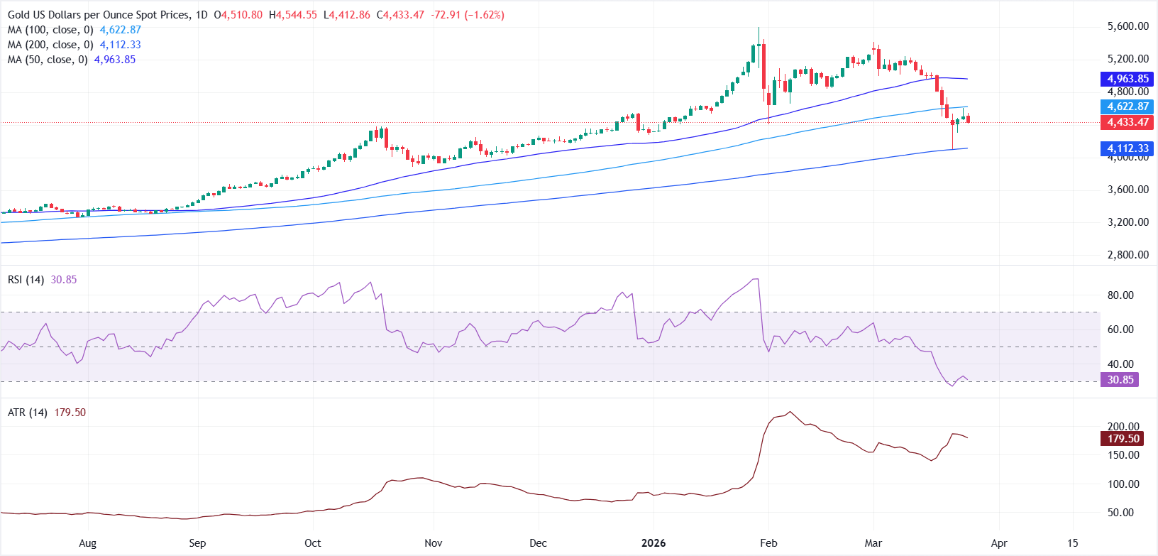 At the time of writing, XAU/USD trades around $4,433, down roughly 1.6% on the day, retreating from Wednesday’s high near $4,602.