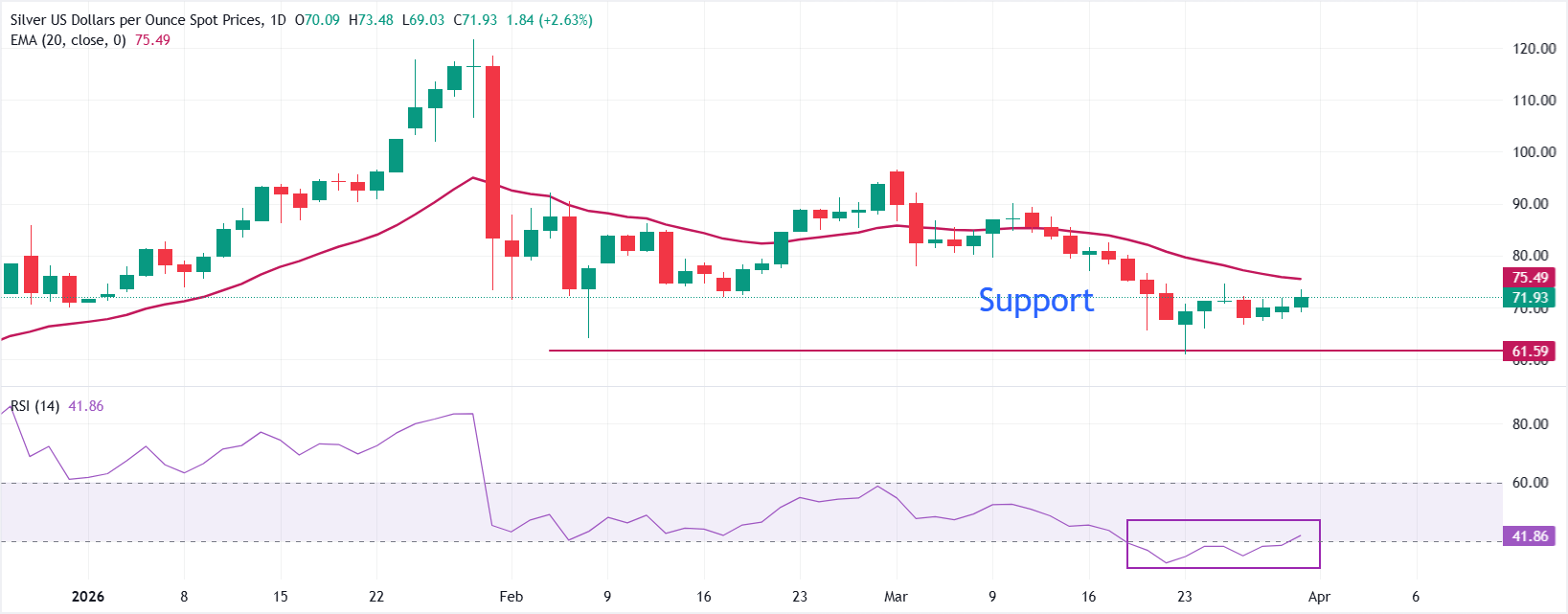 XAG/USD rises to near $73 in the Asian trade on Tuesday. However, the near-term bias remains mildly bearish as price is still below the 20-day Exponential Moving Average (EMA), which now caps at $75.49 and tracks a maturing downswing from the mid-$80s. The sequence of lower daily highs confirms selling pressure, while 14-day Relative Strength Index (RSI) recovers slightly above 40.00, indicating a bearish momentum pause with the downside bias remaining intact.