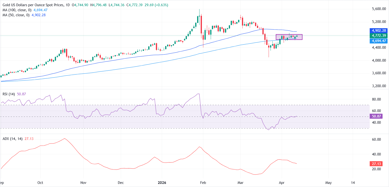 From a technical perspective, the daily chart shows XAU/USD moving in a consolidation pattern. The metal remains under a bearish near-term bias, with spot holding below the 50-day Simple Moving Average (SMA) at $4,902 while still trading above the 100-day SMA at $4,694. The Relative Strength Index (RSI) at 50 is neutral, while the Average Directional Index (ADX) near 27 suggests a trend losing intensity rather than accelerating.