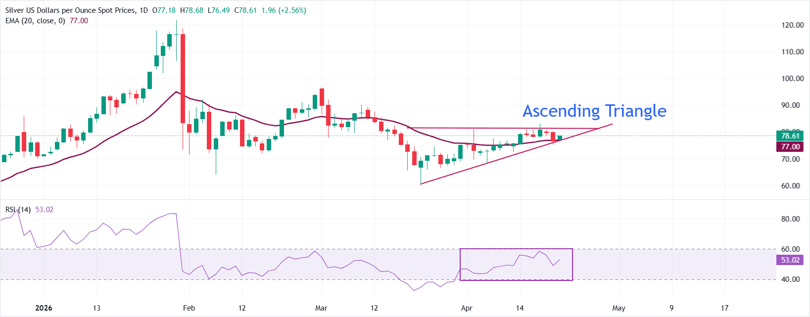 XAG/USD trades higher at around $78.50 as of writing. The metal reflects a neutral near-term bias amid an Ascending Triangle chart formation on a daily timeframe. The pair wobbles around the 20-period Exponential Moving Average (EMA), which is at $77.00, for over a month, reflecting a sideways trend.