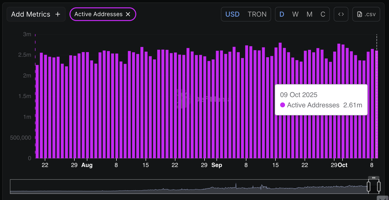• TRX daily active addresses remain elevated at around 2.61 million, indicating steady user engagement and demand.