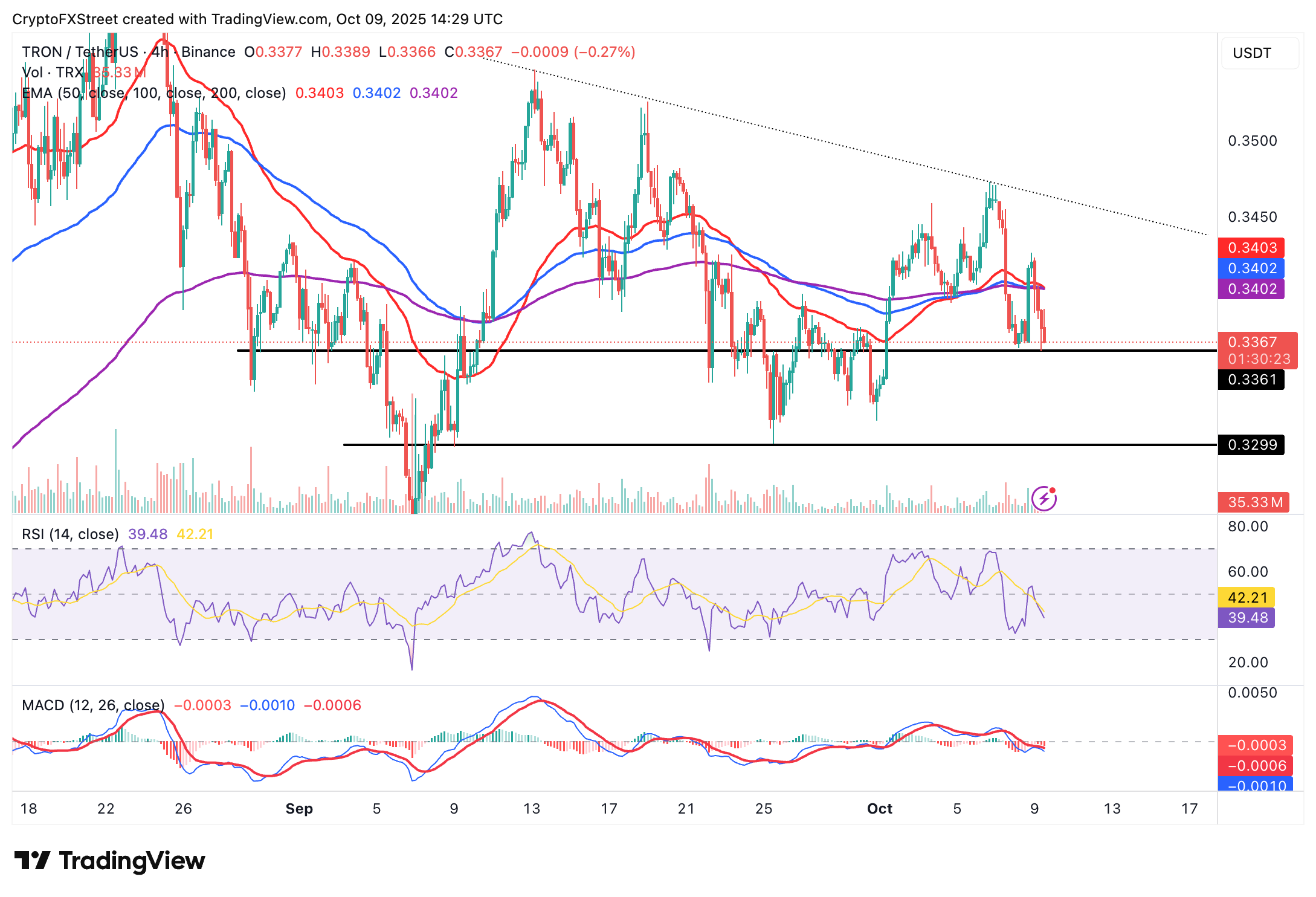 Tron is on the verge of breaching below its short-term support at $0.3361 as investors lean toward risk-off sentiment in the broader cryptocurrency market. Key indicators, such as the Relative Strength Index (RSI) and the Moving Average Convergence Divergence (MACD), reinforce the short-term bearish outlook.