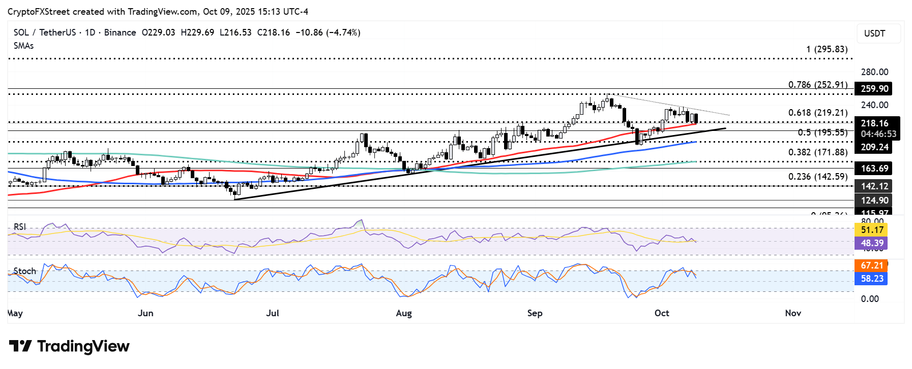 SOL is down 5% on Thursday following a broader crypto market downturn. The altcoin is testing the 61.8% Fibonacci Retracement level around $219 and the 50-day Simple Moving Average (SMA).