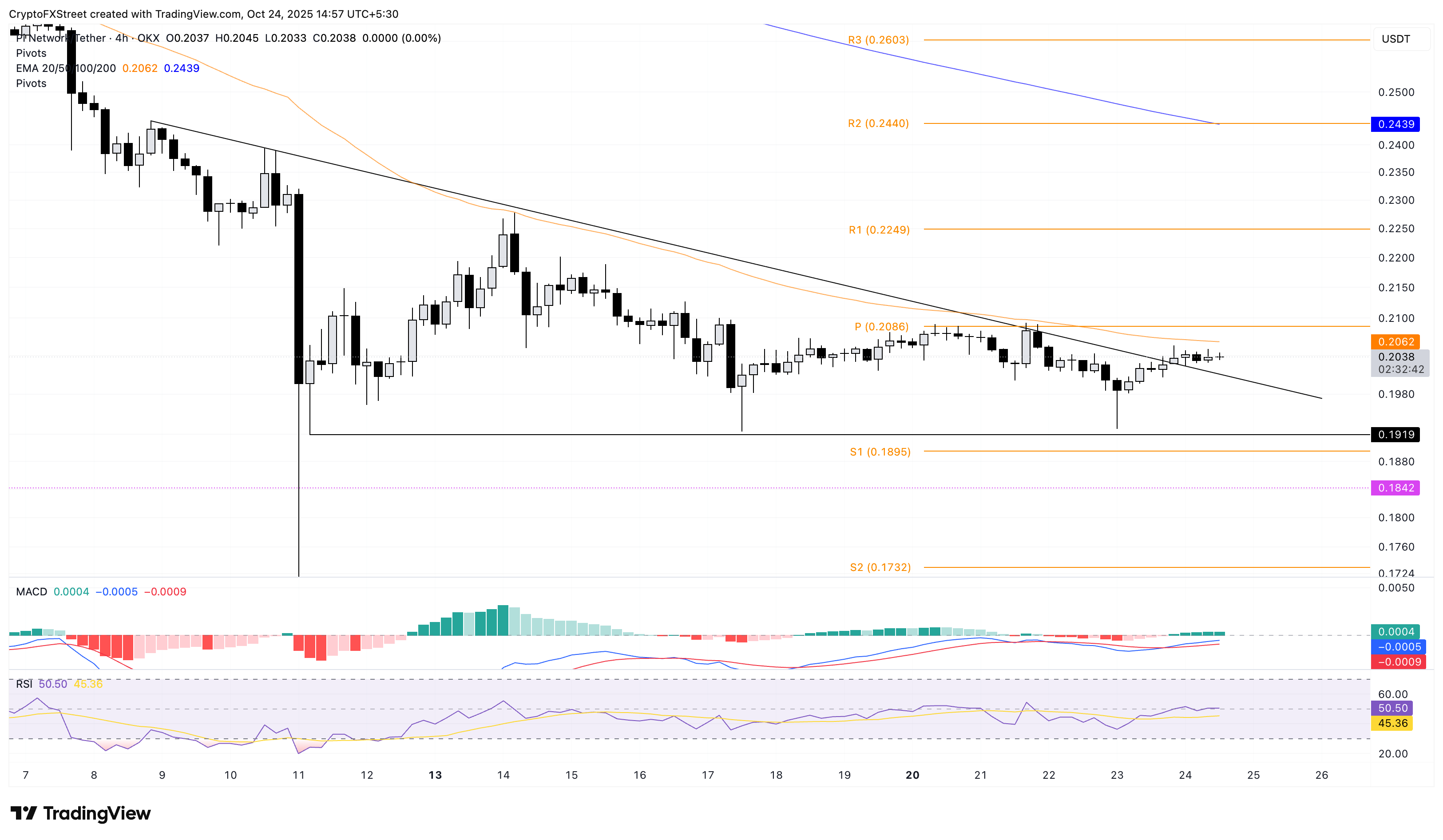 Pi Network exceeds a local resistance trendline, confirming the breakout of a descending triangle pattern on the 4-hour chart. Still, the mobile mining cryptocurrency is facing resistance from the 50-period EMA at $0.2062, struggling to extend its breakout rally.
