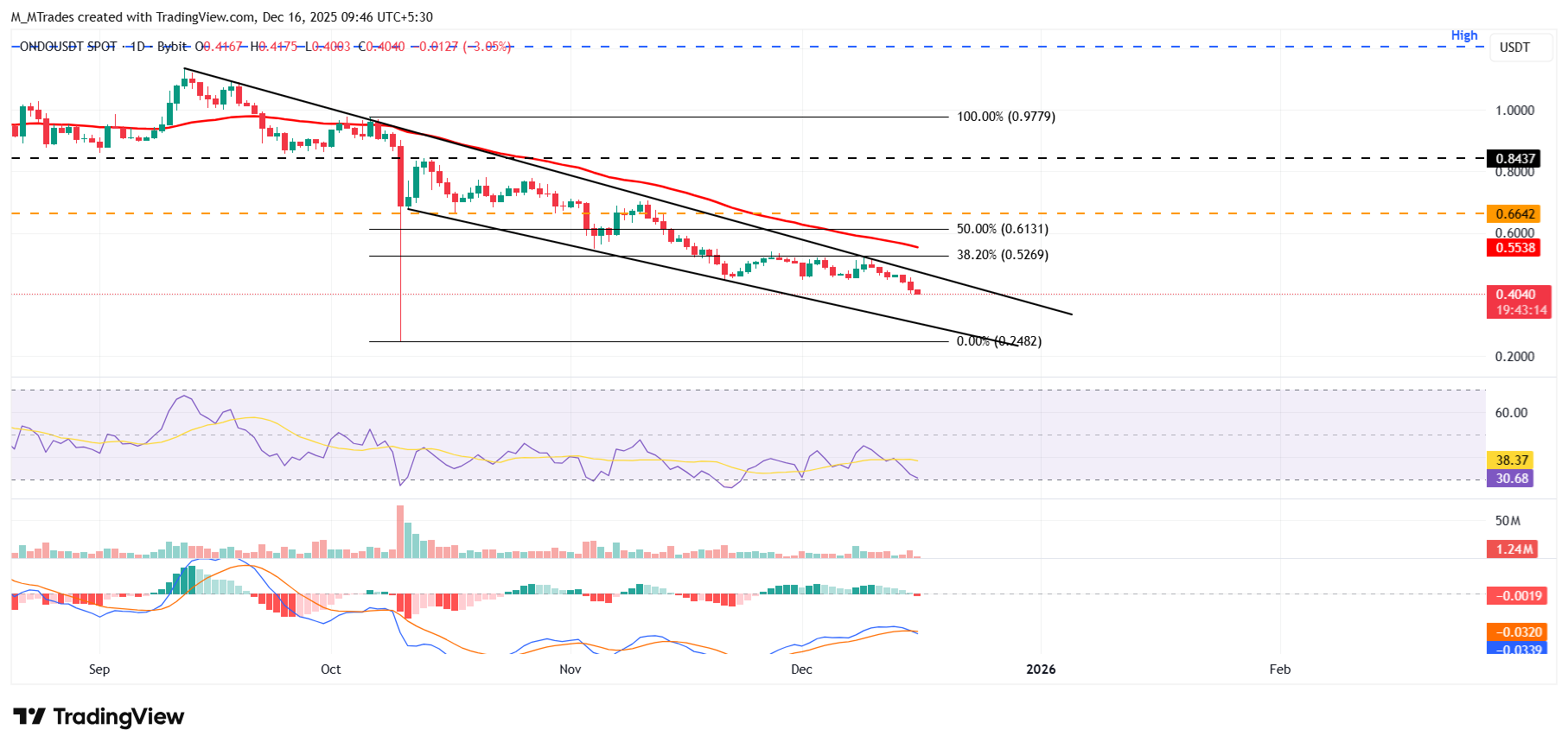 Ondo (ONDO) price continues to correct, trading below $0.40 at the time of writing on Tuesday after dropping 6% the previous day.  Ondo Finance announced on Monday that it plans to integrate with Solana (SOL) in early 2026 to expand its tokenized stocks and Exchange Traded Funds (ETFs) platform, underscoring a long-term bullish outlook. However, short-term price action and derivatives suggest further decline, supported by weakening momentum and fading trader conviction.
