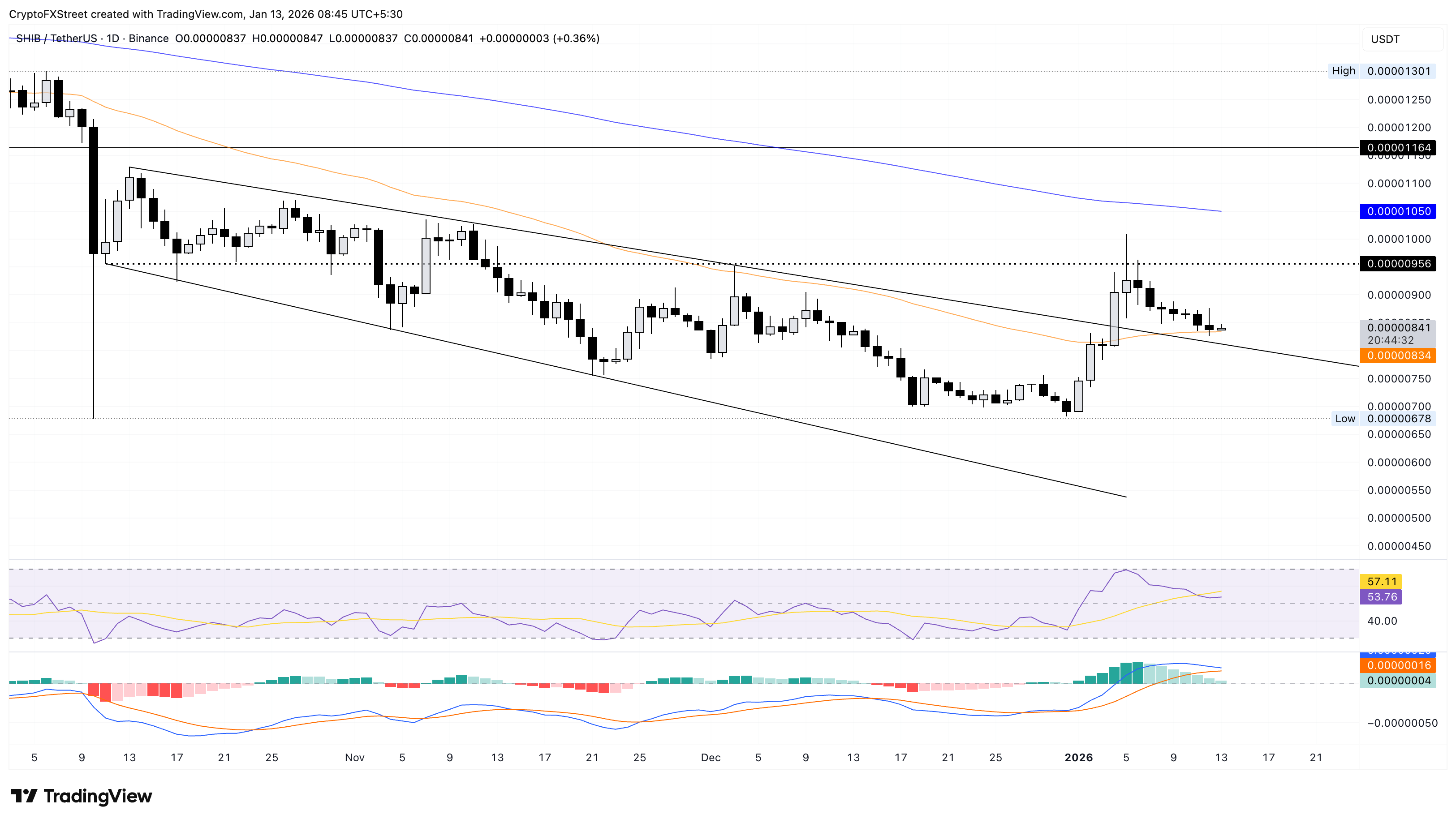 Shiba Inu hovers above the 50-day EMA at $0.00000834, stabilizing after the seven-day decline. At the time of writing, SHIB recovers slightly on Tuesday, after nearly retesting the breakout of a falling channel pattern.