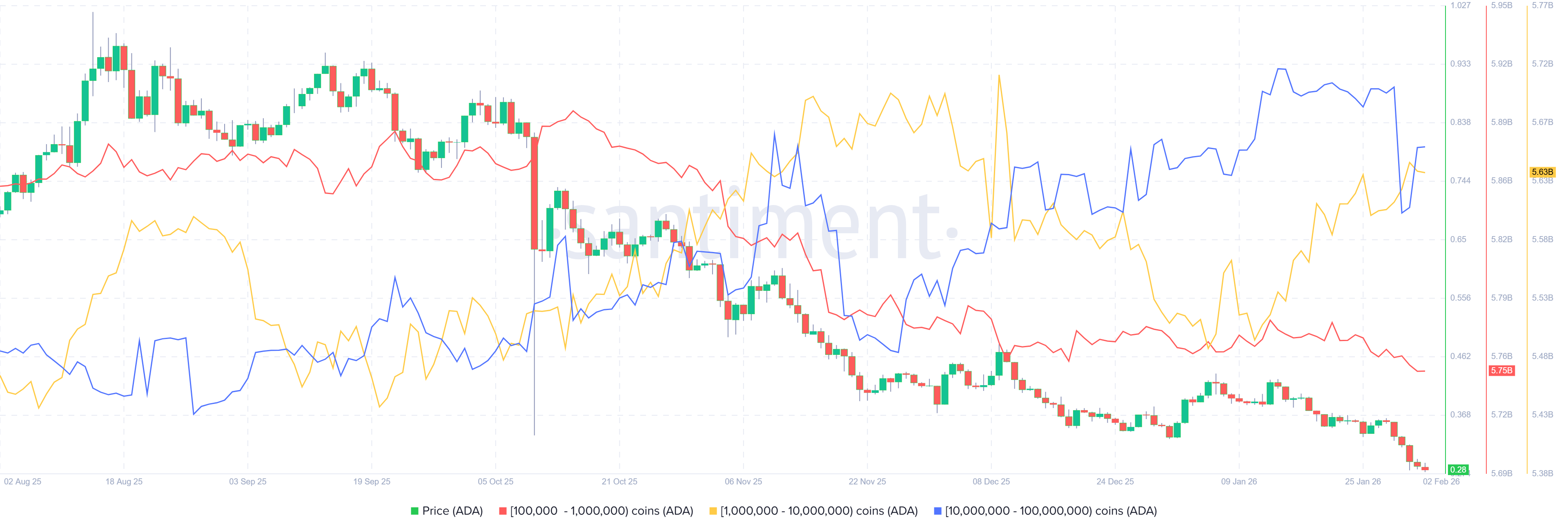 The metric indicates that whales holding between 100,000 and 1 million (red line), 1 million and 10 million (yellow line), and 10 million and 100 million (blue line) ADA tokens have shed 160 million tokens since Thursday.